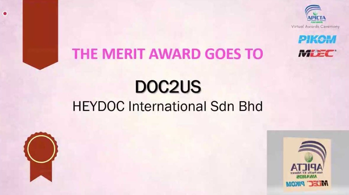 KUALA LUMPUR (19th Feb 2021) – Heydoc International Sdn Bhd’s product DOC2US has been accorded Merit Award for the Inclusion and Community Services - Health and Wellbeing category at the MSC Malaysia APICTA 2020. DOC2US is the only telemedicine solution was presented virtually at the 21st MSC Malaysia APICTA 2020 Virtual Awards Ceremony. DOC2Us is the only telemedicine solution provider receiving this prestigious award and recognition in the Health and Wellbeing Category in MSC Malaysia APICTA 2020.