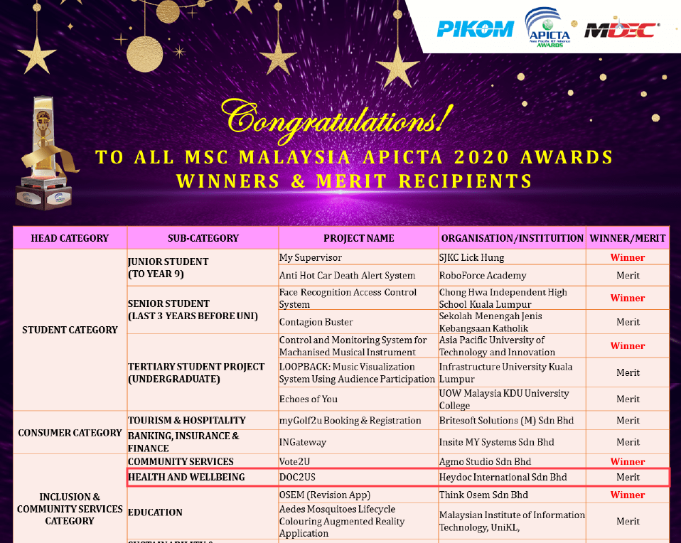 With the merit award, DOC2US will gain local, regional and international exposure through on-going promotional activities and through participation at the Asia Pacific ICT Alliance Awards (APICTA) network!
