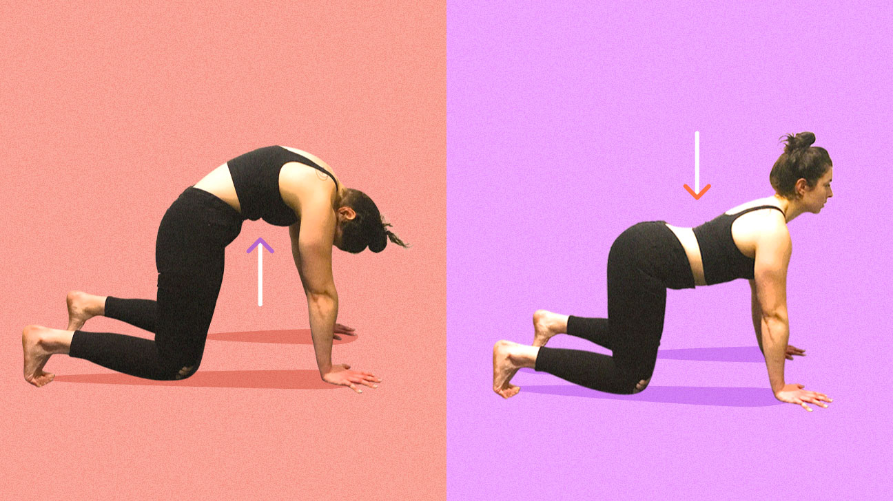 - Cycle through Cat-Cow a few times, keeping stress and pressure out of the head and neck.