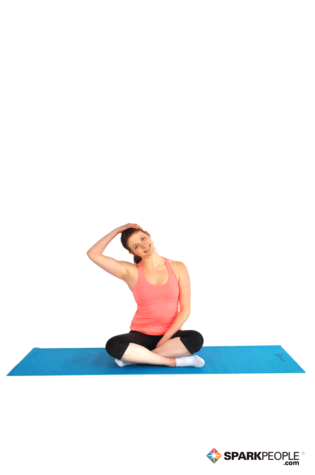 - Place your right hand on your head. Tilt your head to the right. Use a little bit of pressure from your hand on your head to deepen the stretch.