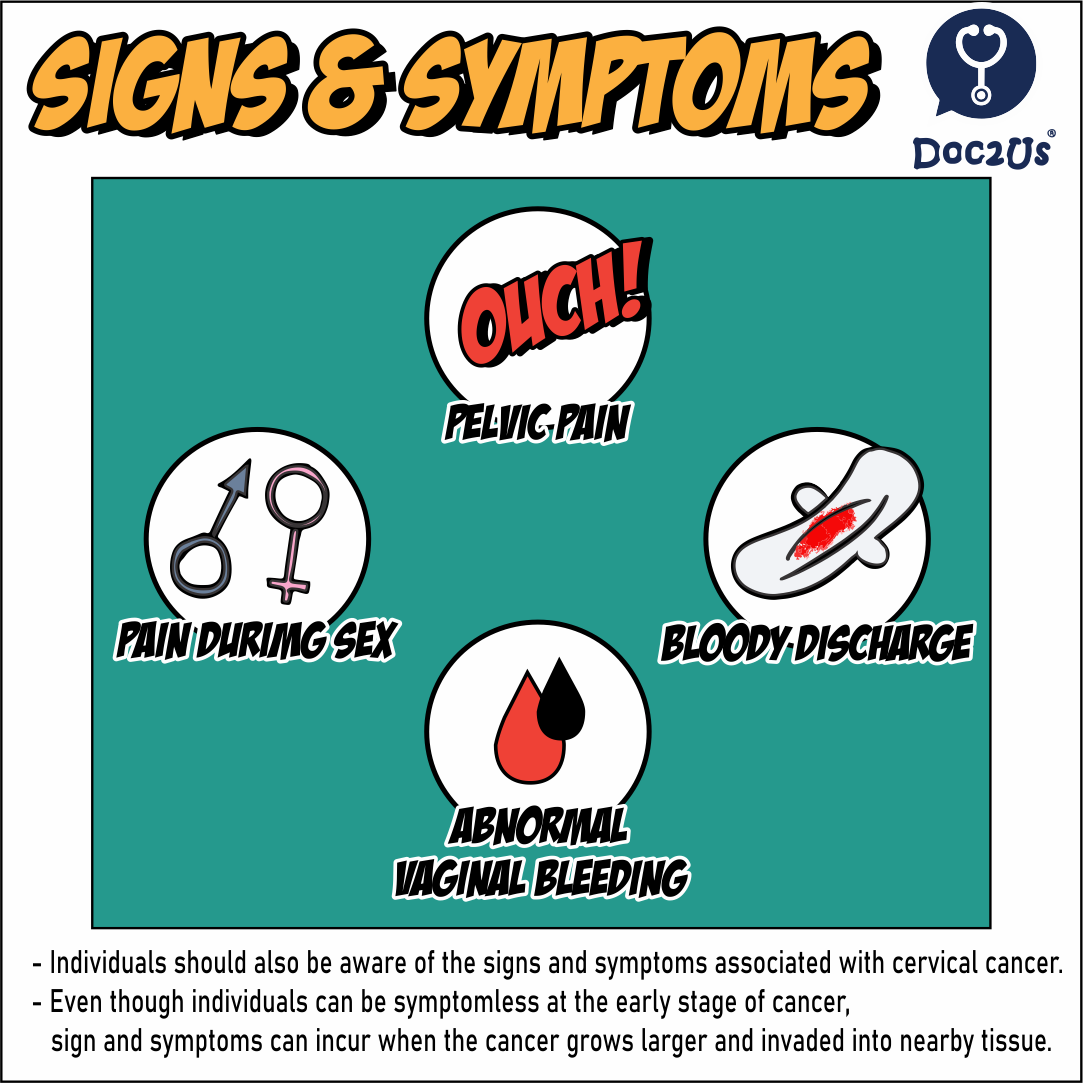 Other than regular screening tests, individuals should also be aware of the signs and symptoms associated with cervical cancer. Even though individuals can be symptomless at the early stage of cancer, sign and symptoms can incur when cancer grows larger and invaded into nearby tissue.