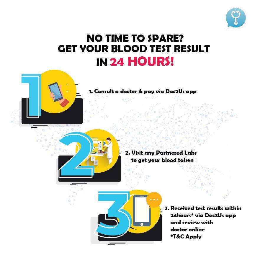 You can get your blood test result in 24 hours!  For more information, open up the Doc2Us app and talk to our doctors to find out more!